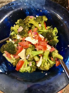 • While the broccoli is cooking, chop red onion, combine with a garlic, chopped tomatoes, olive oil, and a red wine vinegar