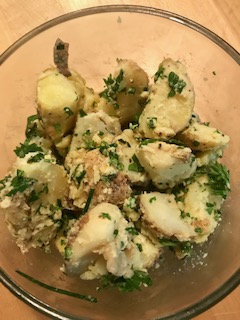• When potatoes are cooked cut in half or quarters and add, while hot, to herb and mayo mixture.